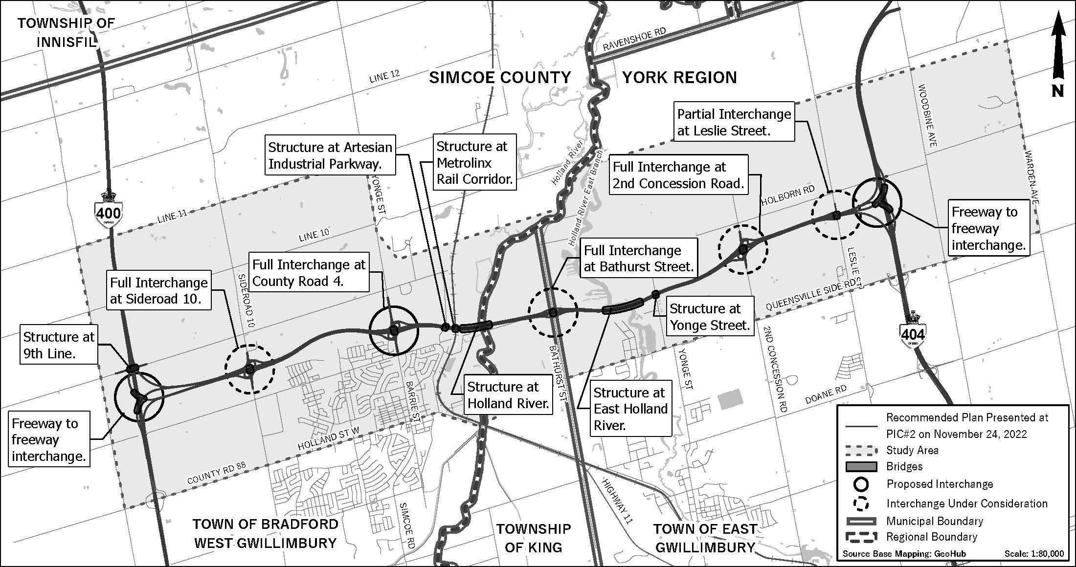 Work is continuing on the west section, where crews are building a temporary detour at 10 Sideroad to support future bridge and interchange construction. Detail design and construction management contracts for the western segment were awarded last year, and tree clearing along the alignment has been completed to facilitate utility relocations. Construction is also underway on a new southbound lane on Highway 400 that will connect to the future bypass.